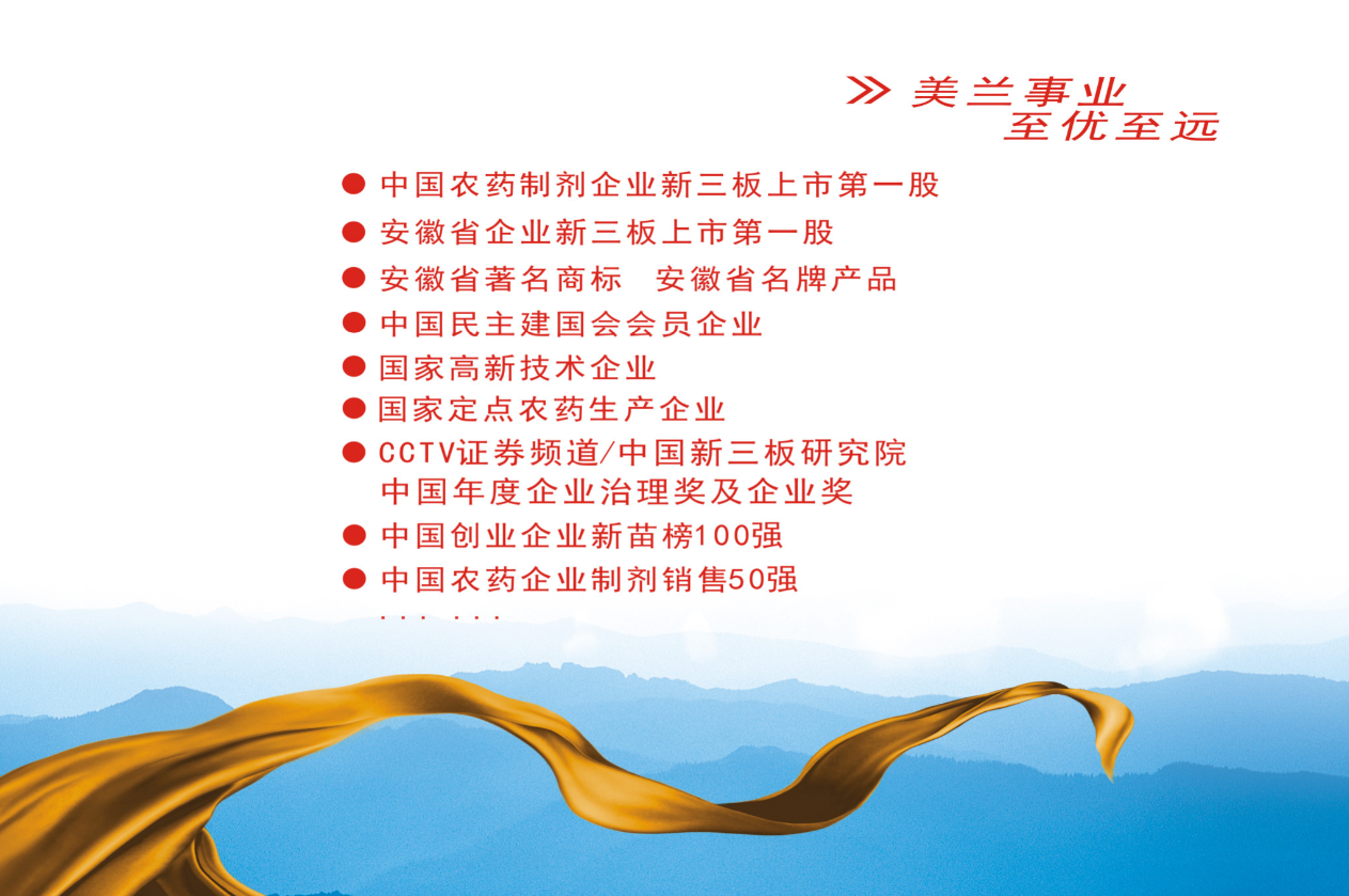 创新美兰(合肥)股份有限公司(以下简称“美兰股份”)致力于农药新产品、新剂型、新工艺的研发,积极响应国家政策向高效、广谱、低毒方向的产品发展,是集新农药技术研发、农药复配生产、销售为一体的国家级定点农药生产企业。美兰股份注册资本6006万元,系中国农药制剂第一家挂牌新三板的企业,也是安徽省首家挂牌新三板的企业,现为新三板创新层企业、高新技术企业、高新区拟上市后备企业、合肥市工业设计中心、中国农药发展与应用协会理事单位、中国民主建国会会员企业、合肥市科技小巨人重点培育企业等。